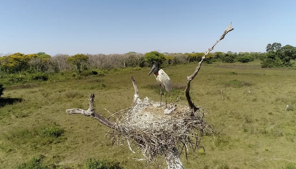 Construído no alto de um tronco seco de quase 12 metros, o casal de tuiuiús leva alimento e proteção aos recém-nascidos. São quatro filhotes com apenas uma semana de vida, o que ainda deixa eles em situação de fragilidade e dependência dos pais.