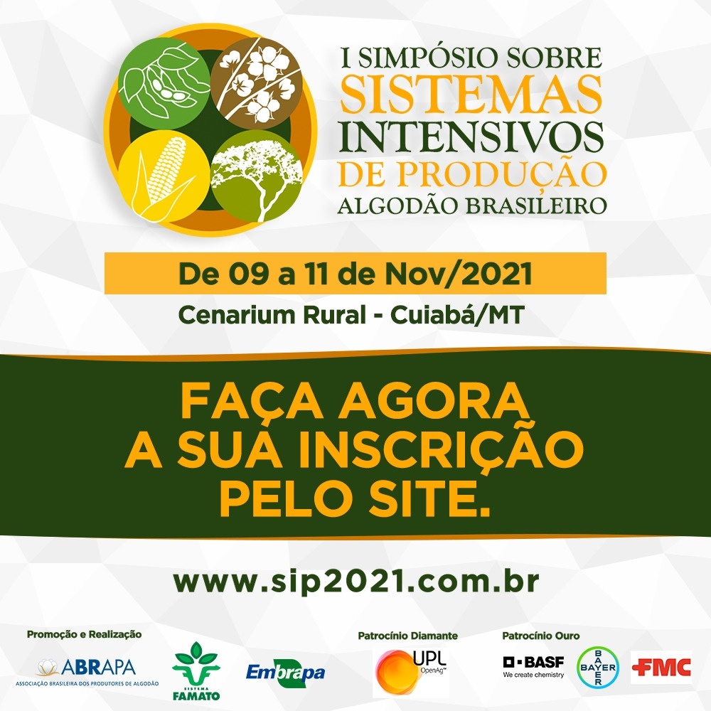 O I Simpósio sobre Sistemas Intensivos de Produção de Algodão Brasileiro é promovido pela Empresa Brasileira de Pesquisa Agropecuária (Embrapa), Associação Brasileira dos Produtores de Algodão e Sistema Famato. O evento visa discutir os principais problemas relacionados aos sistemas intensivos de produção, com participação de produtores, técnicos, pesquisadores e acadêmicos.