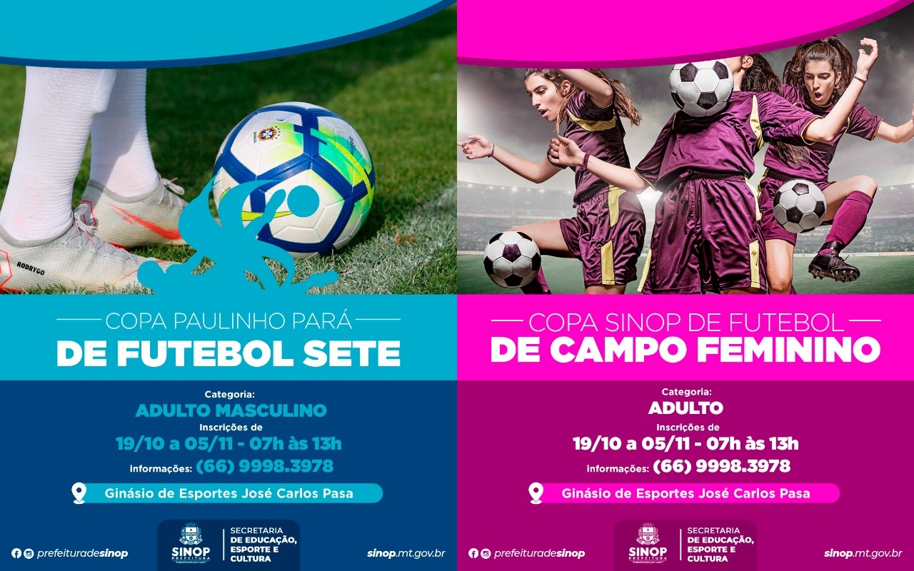 A Prefeitura de Sinop, por meio da Gerência de Esportes, abre inscrições para a Copa Paulinho Pará de Futebol Sete e para a Copa Sinop de Futebol de Campo Feminino. Nesta terça-feira (19), as equipes interessadas em participar poderão procurar a Gerência de Esportes, localizada no Ginásio José Carlos Pasa, das 07h às 13h, até o dia 05/11. A abertura das competições será no dia 10/11.