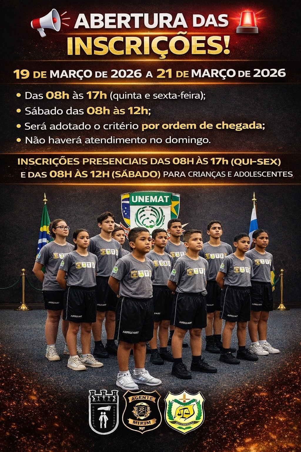 Estão abertas as inscrições para o processo seletivo do Programa de Prevenção às Drogas e à Criminalidade Agente Mirim 2026, em Sinop. Ao todo, são ofertadas 120 vagas imediatas, além de cadastro reserva, destinadas a adolescentes com idade entre 10 e 17 anos.
