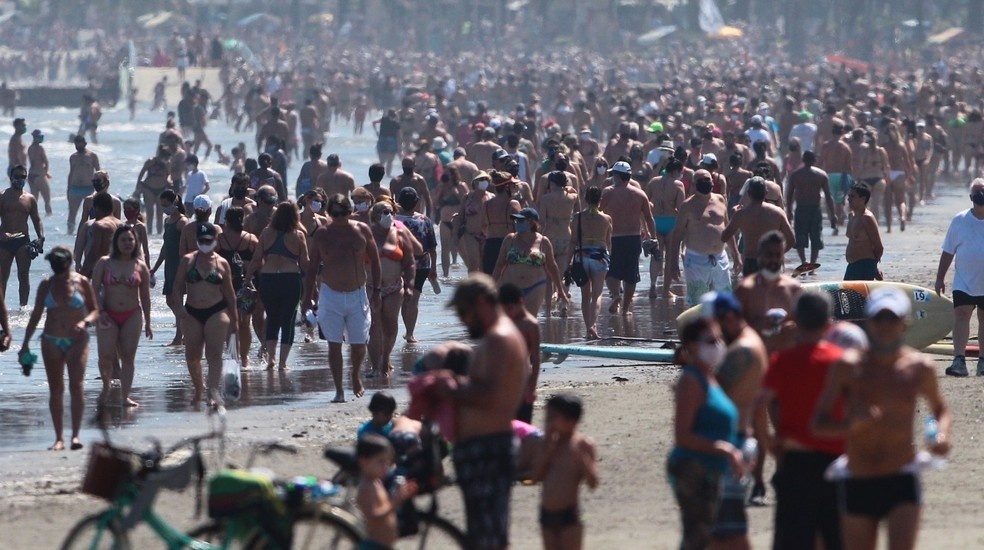 Neste domingo, foi registrado em Santos, no litoral de São Paulo, um multidão de pessoas na praia. A região recebeu muitos turistas no últimos dias que lotaram a rodovia que dão acesso a baixada santista.