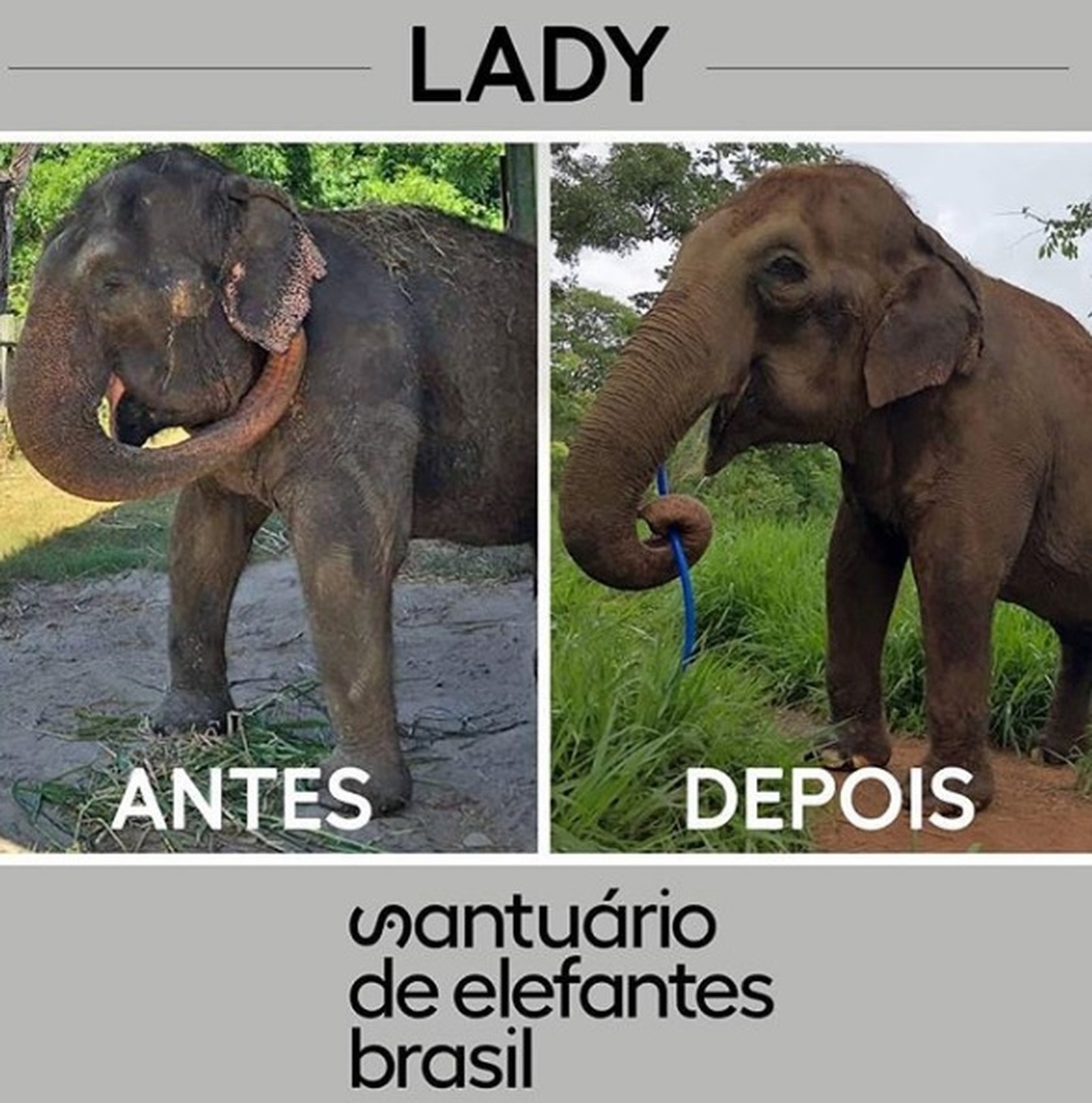 Seis semanas após chegar ao Santuário de Elefantes do Brasil, localizado em Chapada dos Guimarães, a elefanta Lady apresenta melhora significativa tanto na saúde quanto na adaptação ao local. A página oficial do santuário em uma rede social postou uma foto de antes e depois de Lady. A primeira foto foi tirada alguns dias antes de chegar ao santuário, ainda no zoológico do qual foi resgatada, em João Pessoa/PB, e a outra, feita nesta semana.