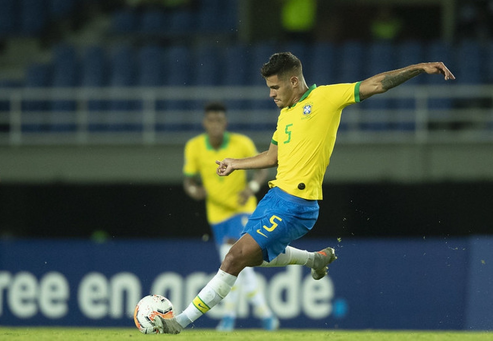 Bruno Guimarães em ação pela seleção brasileira contra o Uruguai