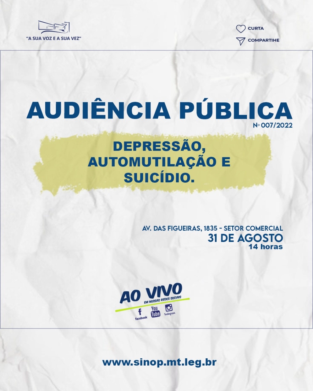 A Câmara de Sinop promove na próxima quarta (31) audiência pública que discute Depressão, Automutilação e Suicídio, sendo presidida pelo vereador Célio Garcia (União Brasil), com a participação de vários palestrantes para debater a temática. O evento é aberto ao público e tem início às 14h, no Plenário Deputado Jorge Abreu da Casa de Leis.