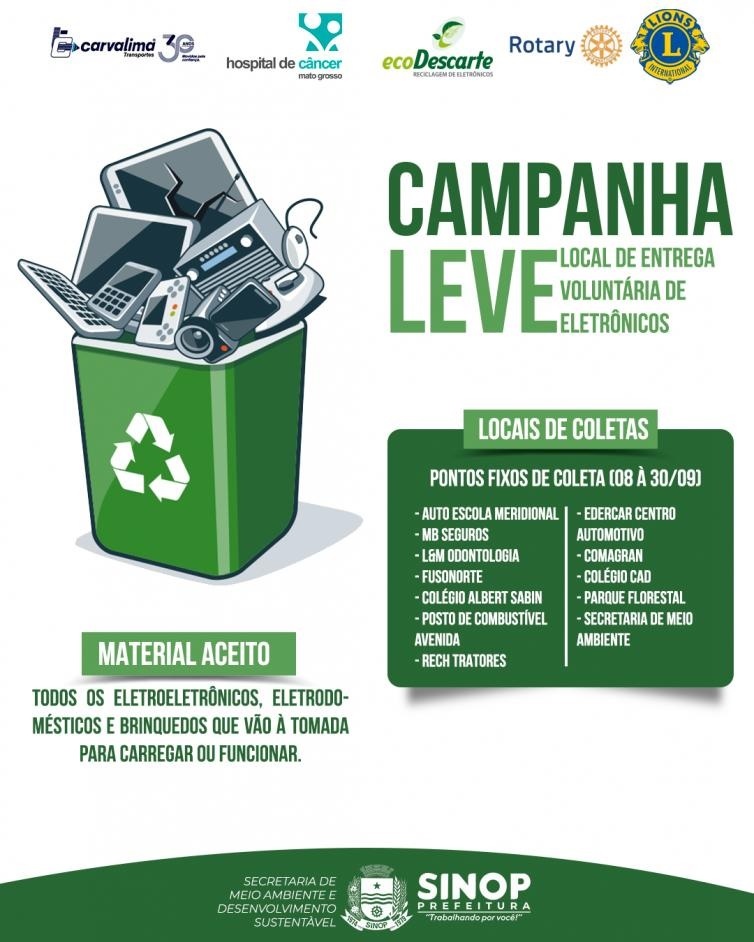 Esta é a última semana de arrecadação da Campanha Leve (Local de Entrega Voluntária de Eletrônicos). O projeto desenvolvido pela Secretaria de Meio Ambiente e Desenvolvimento Sustentável de Sinop encerra na quinta (30). Até o momento pouco mais de 5 toneladas de eletrônicos foram recolhidos.