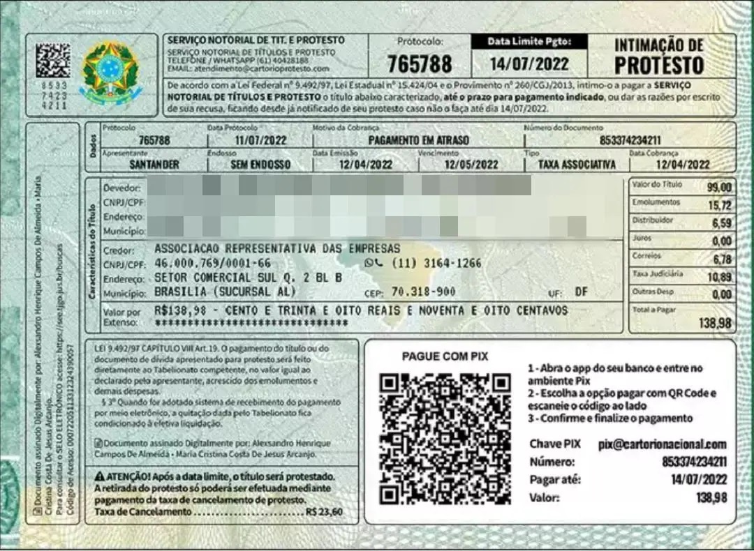 Em caso de recebimento de intimação, seja por meio postal ou eletrônico, a recomendação é confirmar a veracidade da notificação. Para isso, é preciso telefonar para o Cartório e/ou acessar o site oficial para consultar, de forma gratuita, pelo número do CPF ou CNPJ.