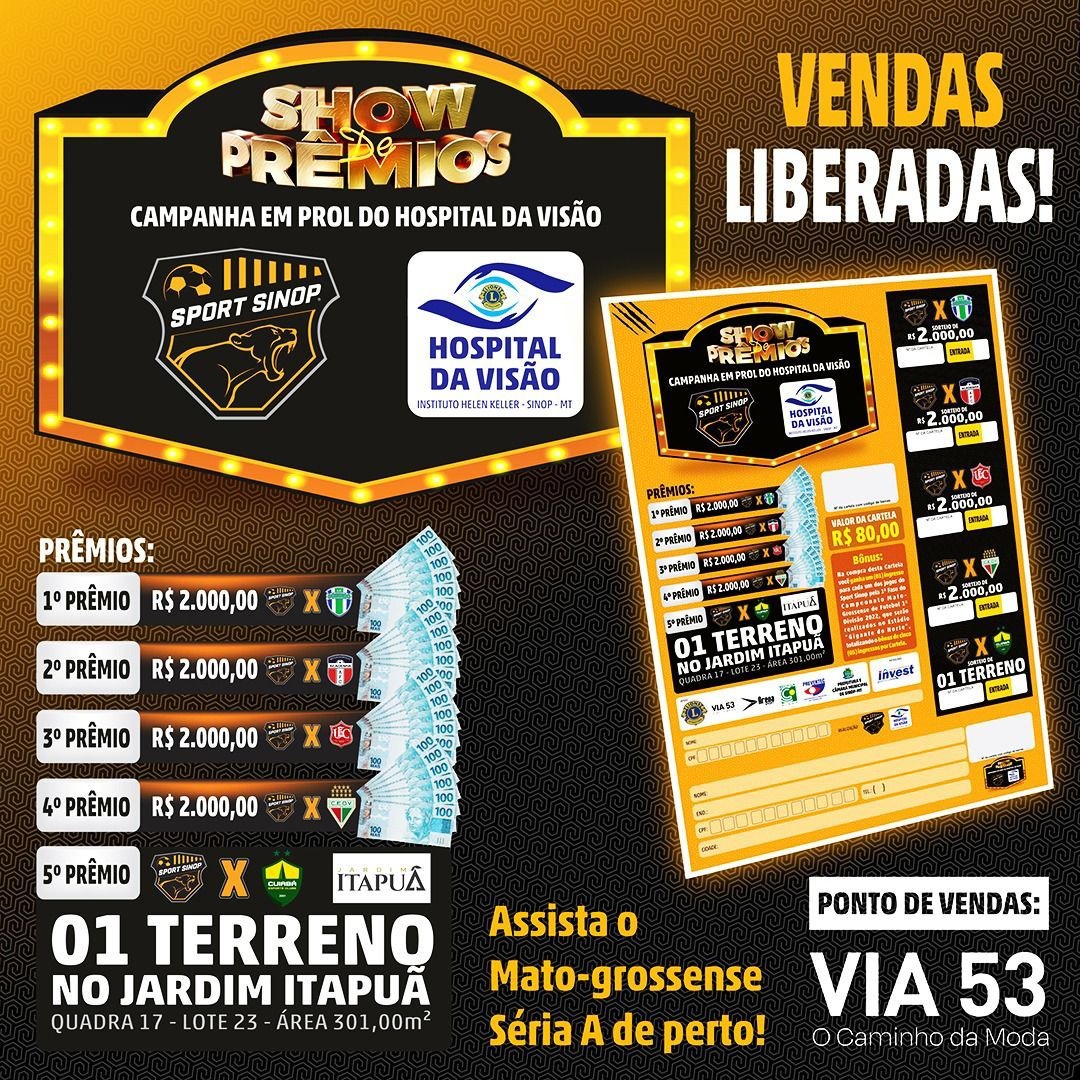 Ao todo serão cinco jogos do Sport Sinop no Estádio Gigante do Norte pela primeira fase do Campeonato Mato-grossense e em todos eles haverá algum sorteio. Serão R$ 2 mil (cada) sorteados nos jogos contra Sorriso, Academia, União e Operário. Para encerrar o primeiro turno, na partida contra o Cuiabá, o clube fará o super sorteio de um terreno de área de 301 m², no Jardim Itapuã.