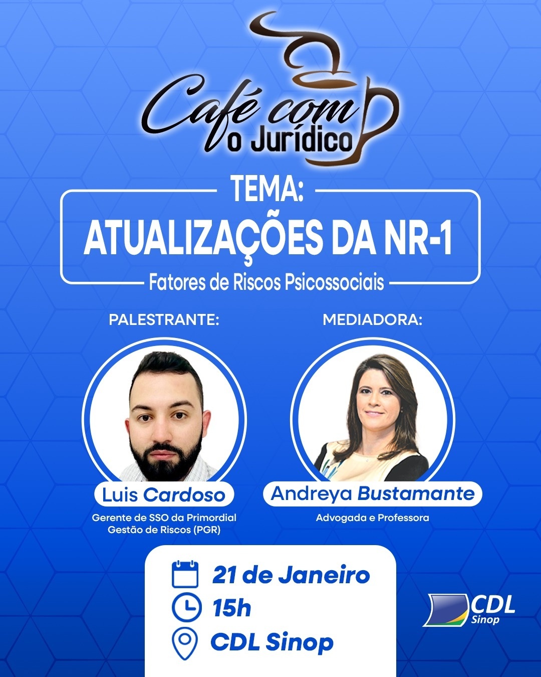 A CDL Sinop realiza, na próxima quarta (21), mais uma edição do Café Com o Jurídico, com início às 15h, na sede da entidade. O encontro terá como tema “Atualizações da NR-1 e os Fatores de Riscos Psicossociais”, assunto de interesse direto de empresários, gestores e profissionais da área de recursos humanos.