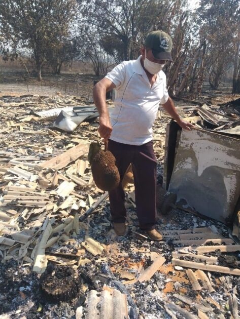 Desolado, o agricultor Cícero Corrêa caminha por cima dos escombros do que sobrou da casa mobiliada, totalmente consumida pelo fogo avassalador, que não poupou nada dentro do pequeno sítio de cinco alqueires. Além da moradia, dois pomares frutíferos, cercas e uma grande área de pastagem foram destruídas. “O pouco que eu tinha o fogo levou. Agora, aos 66 anos de idade, não sei onde vou ficar e peço socorro”, diz.