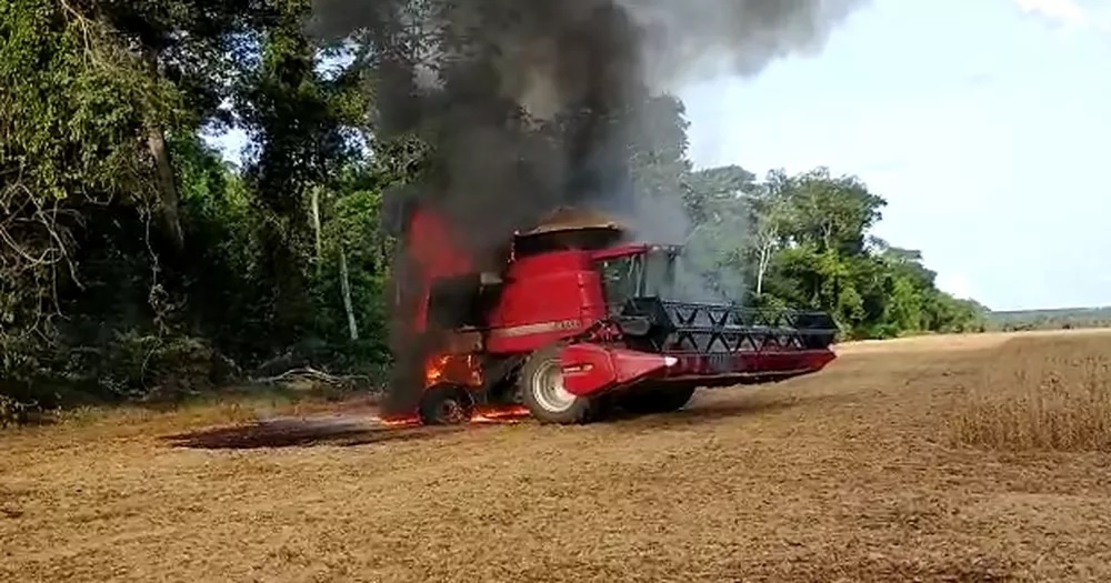Uma colheitadeira ficou completamente destruída após pegar fogo enquanto ainda estava em uso pelo agricultor. O produtor não se feriu, mas ficou com um prejuízo de R$ 1,74 milhão, já que a máquina estava sem seguro. O caso aconteceu na última quinta (20).