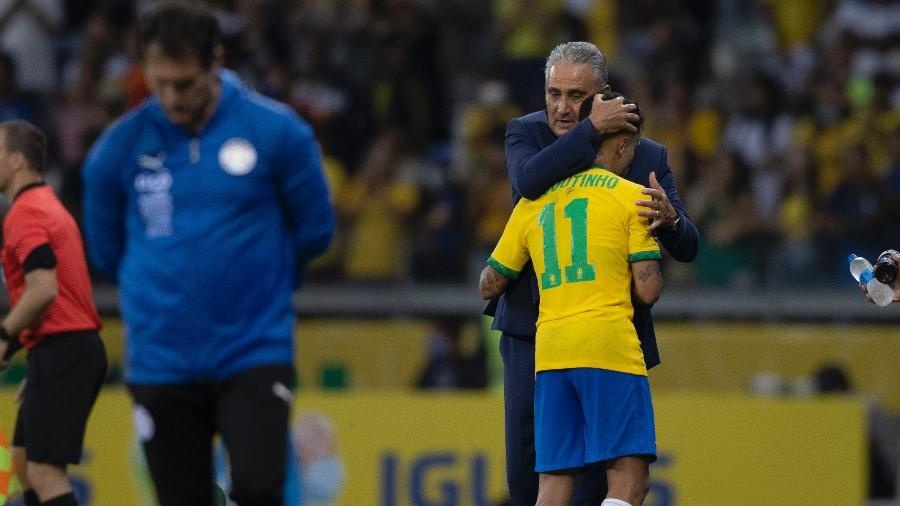 Tite abraça Phillipe Coutinho, um dos seus preferidos – Foto: Lucas Figueiredo