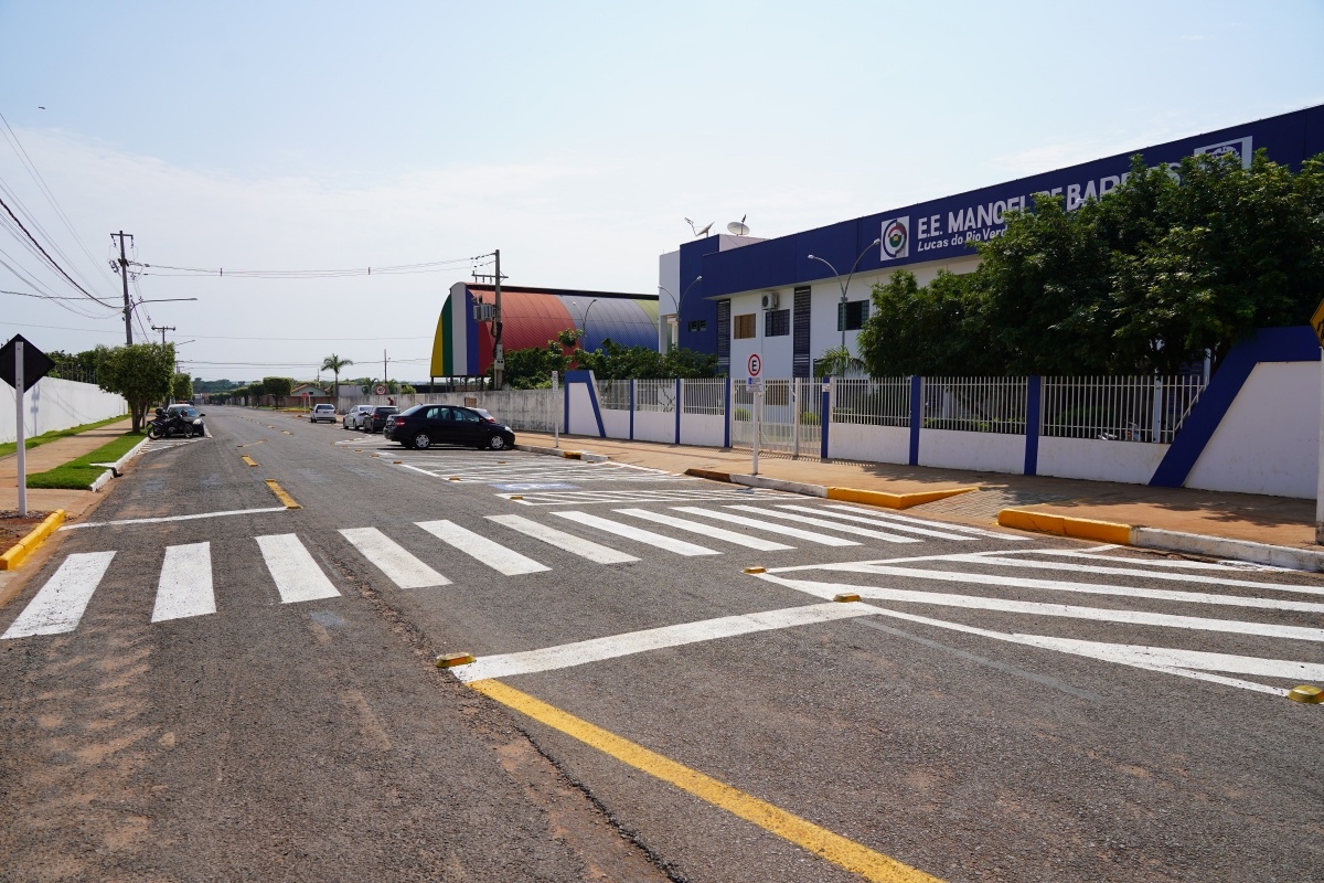 Com o objetivo de reduzir a velocidade em área escolar, sem aumentar o número de lombadas na cidade, a Prefeitura de Lucas do Rio Verde, por meio da Secretaria de Segurança e Trânsito, concluiu a intervenção no trânsito da região da Escola Estadual Manoel de Barros, no bairro Parque das Américas.