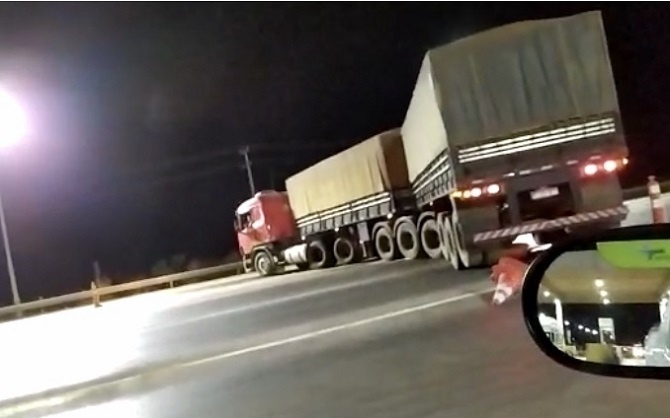 Uma caminhoneira, bastante irritada, trancou o acesso à praça de pedágio na BR-163, em Sorriso, na noite de segunda-feira (10). Ela atravessou a carreta na pista para impedir a passagem de outros veículos no local após se revoltar com a cobrança feita pela atendente. A motorista se identificou como Ângela Cristina e disse que a concessionária quis cobrar por um eixo a mais, que estava suspenso.