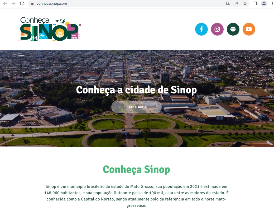 O site ainda oferece links para as redes sociais oficiais da prefeitura (Instagram, Facebook, YouTube), site oficial (https://www.conhecasinop.com/), bem como a ferramenta Sinop em Números.