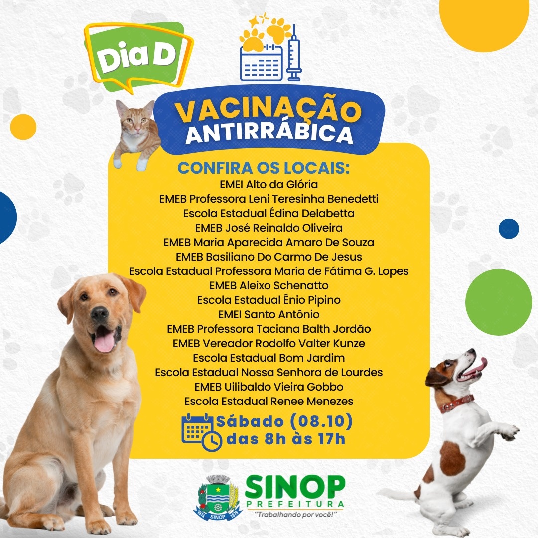 O dia D para vacinação antirrábica será neste sábado (08), das 8H às 17h, em diversos locais, atendendo todas as regiões do município.