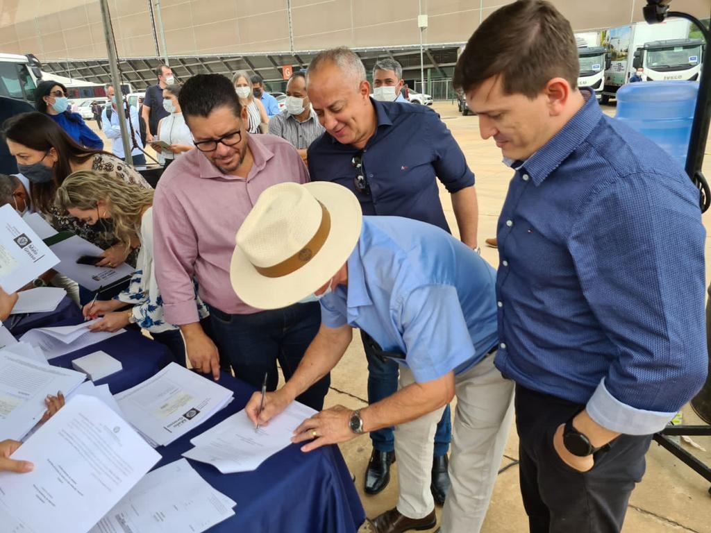 O prefeito Roberto Dorner e o secretário de Desenvolvimento Econômico, Klayton Gonçalves, estiveram nesta sexta-feira (08) em Cuiabá recebendo equipamentos e maquinários do Governo do Estado de Mato Grosso, que fazem parte do programa Mais MT, destinados para a agricultura familiar. O município de Sinop foi contemplado com a entrega de patrulha mecanizada (trator, grade e carreta), escavadeira hidráulica sob esteiras, caminhão tipo truck, traçado com caçamba e uma pickup strada.