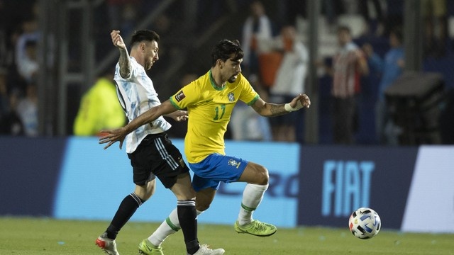 Paquetá passa por Messi durante Argentina x Brasil – Foto: Lucas Figueiredo