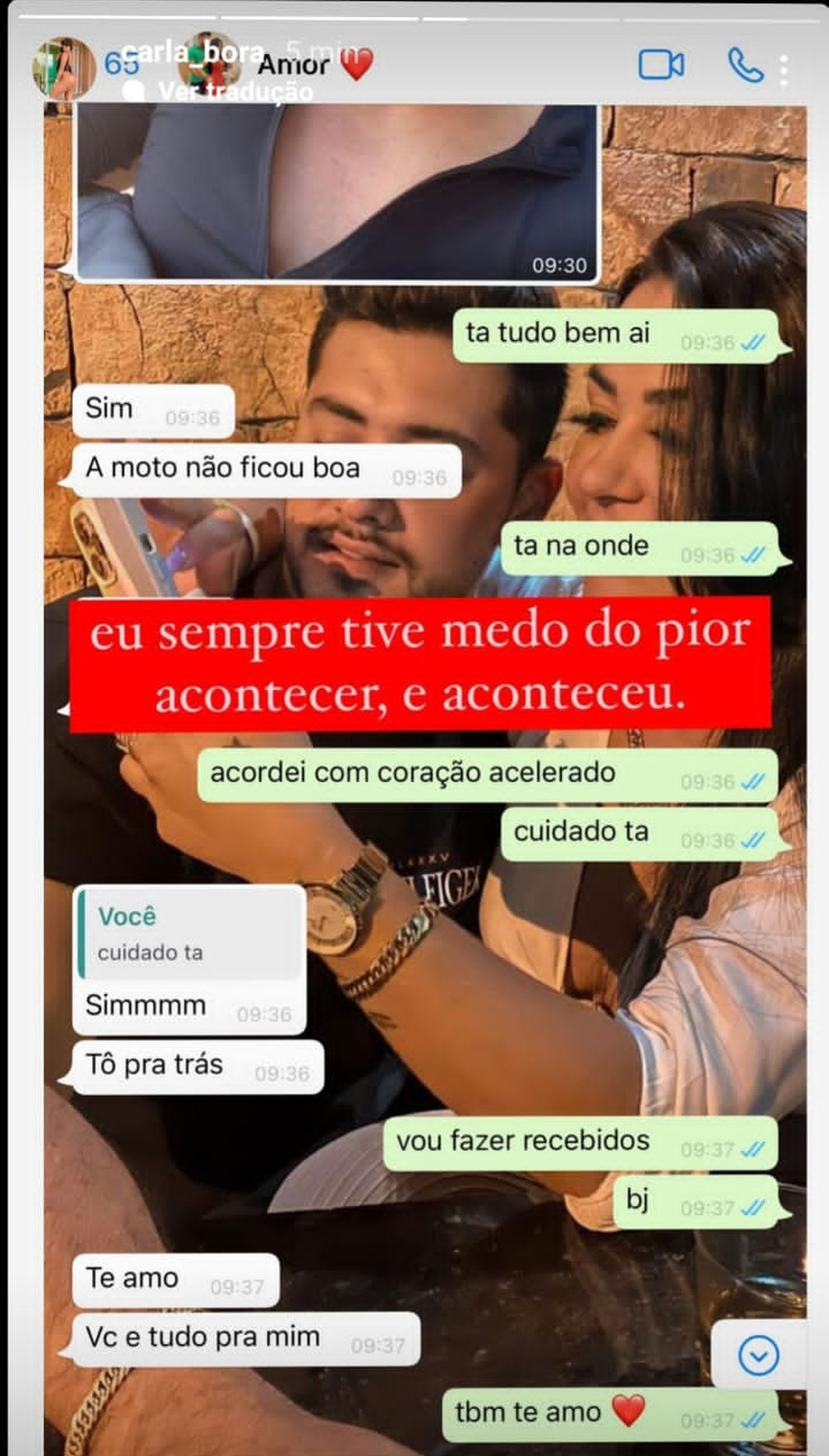 Na última troca de mensagens com a namorada, Rogério afirmou que a moto dele 'não ficou boa'. Nas redes sociais, Carla Bora publicou as últimas conversas que teve com o namorado, na manhã deste domingo, afirmando que tinha medo do 'pior acontecer'. Em um trecho da conversa. ela diz a Rogério que acordou com o 'coração acelerado' e que e era para ele se cuidar.