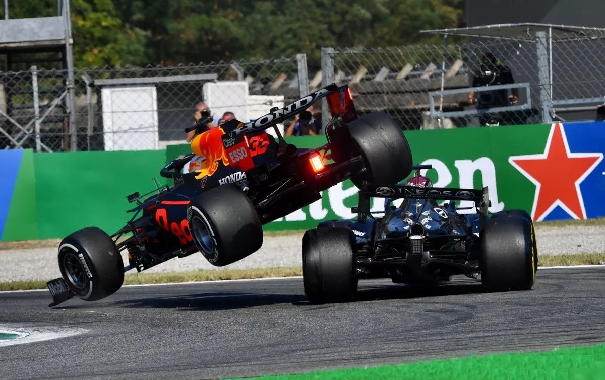 Um dos momentos mais tensos da disputa entre Lewis Hamilton e Max Verstappen em 2021 veio na Itália. Ao sair dos boxes, o holandês viu o rival passando por ele e tentou se manter à frente. Os dois dividiram a primeira chicane e, após o toque, a Red Bull foi lançada por cima da Mercedes.
