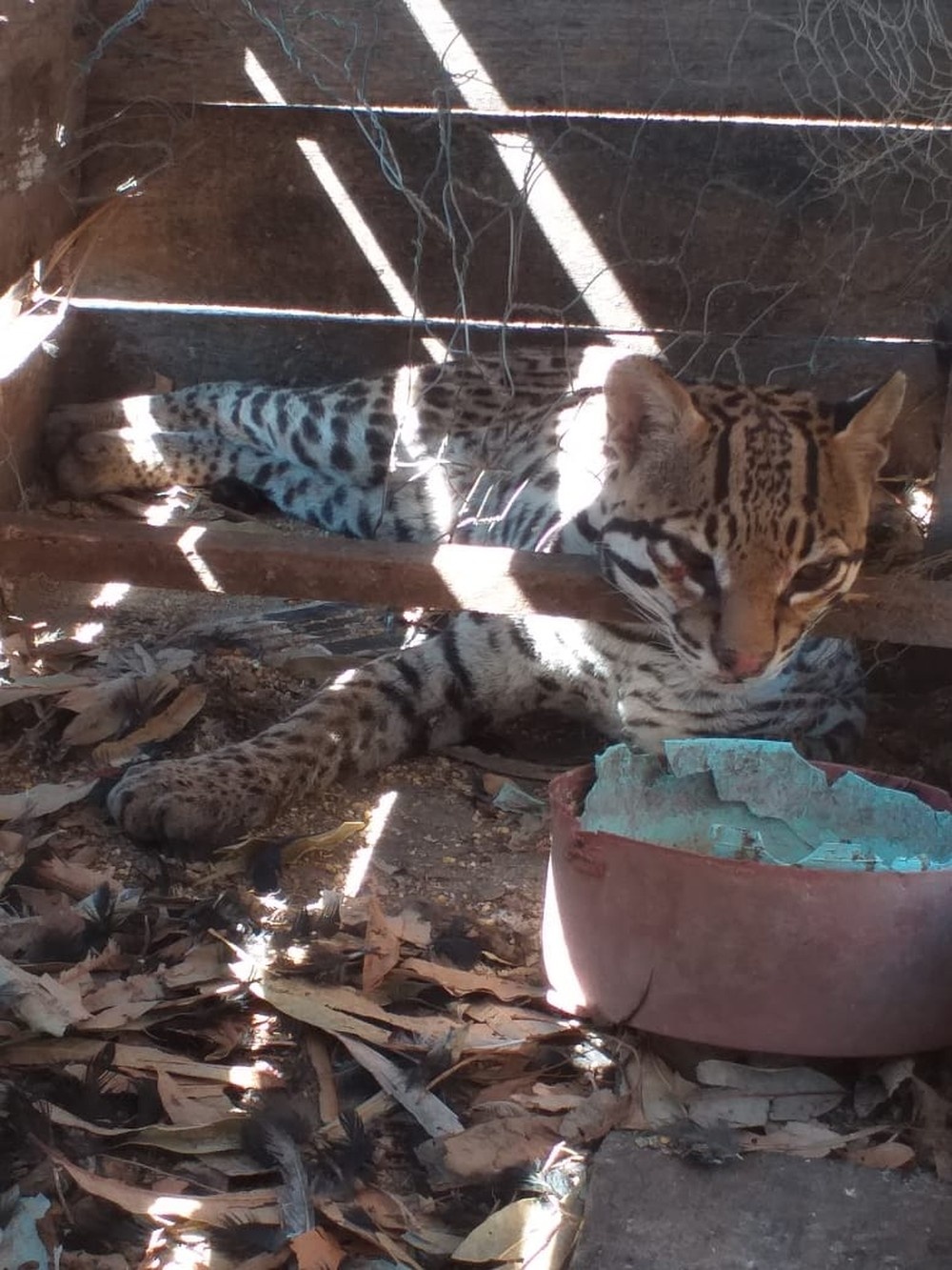 A jaguatirica é um macho adulto e foi encontrada pelos militares em uma armadilha de madeira. Segundo os bombeiros, o fazendeiro contou que sentiu falta de alguns animais na propriedade e, pela experiência, decidiu montar a armadilha com uma isca dentro.