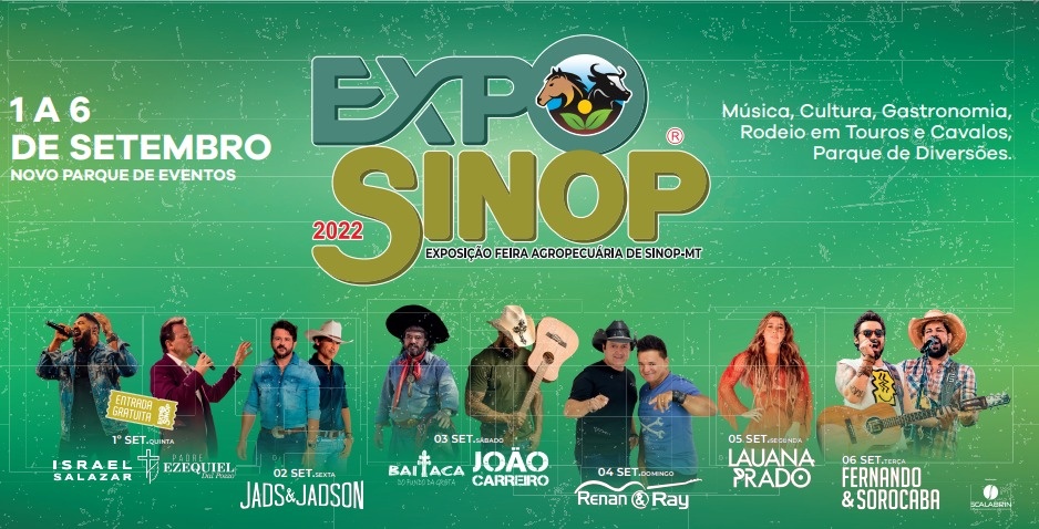 A ExpoSinop vai começar em uma quinta-feira, com portões abertos e será encerrada em uma terça-feira, véspera de feriado nacional. Serão 8 shows durante o evento.