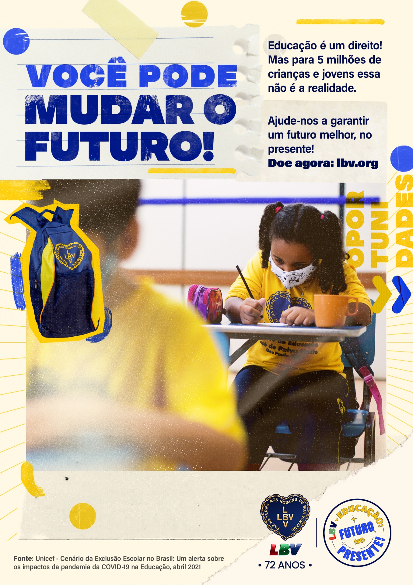 Diante de tantos desafios, a Legião da Boa Vontade (LBV) inicia mais uma importante mobilização social em apoio à educação brasileira. Intitulada “LBV — Educação: Futuro no Presente!”, a iniciativa visa angariar doações e entregar no começo do ano letivo 20 mil kits de material pedagógico para crianças, adolescentes e jovens atendidos pela Instituição e também por organizações parceiras no país.
