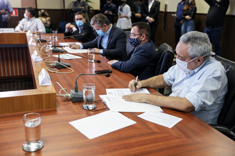 Além do governador, assinaram os termos o secretário de Estado de Infraestrutura e Logística (Sinfra), Marcelo de Oliveira, a prefeita Janailza Taveira Leite (São Félix do Araguaia) e os prefeitos João Cleiton Medeiros (Canabrava do Norte), Joabe Almeida dos Santos (Santo Afonso) e Fábio Martins Junqueira (Tangará da Serra) durante evento realizado no Palácio Paiaguás.