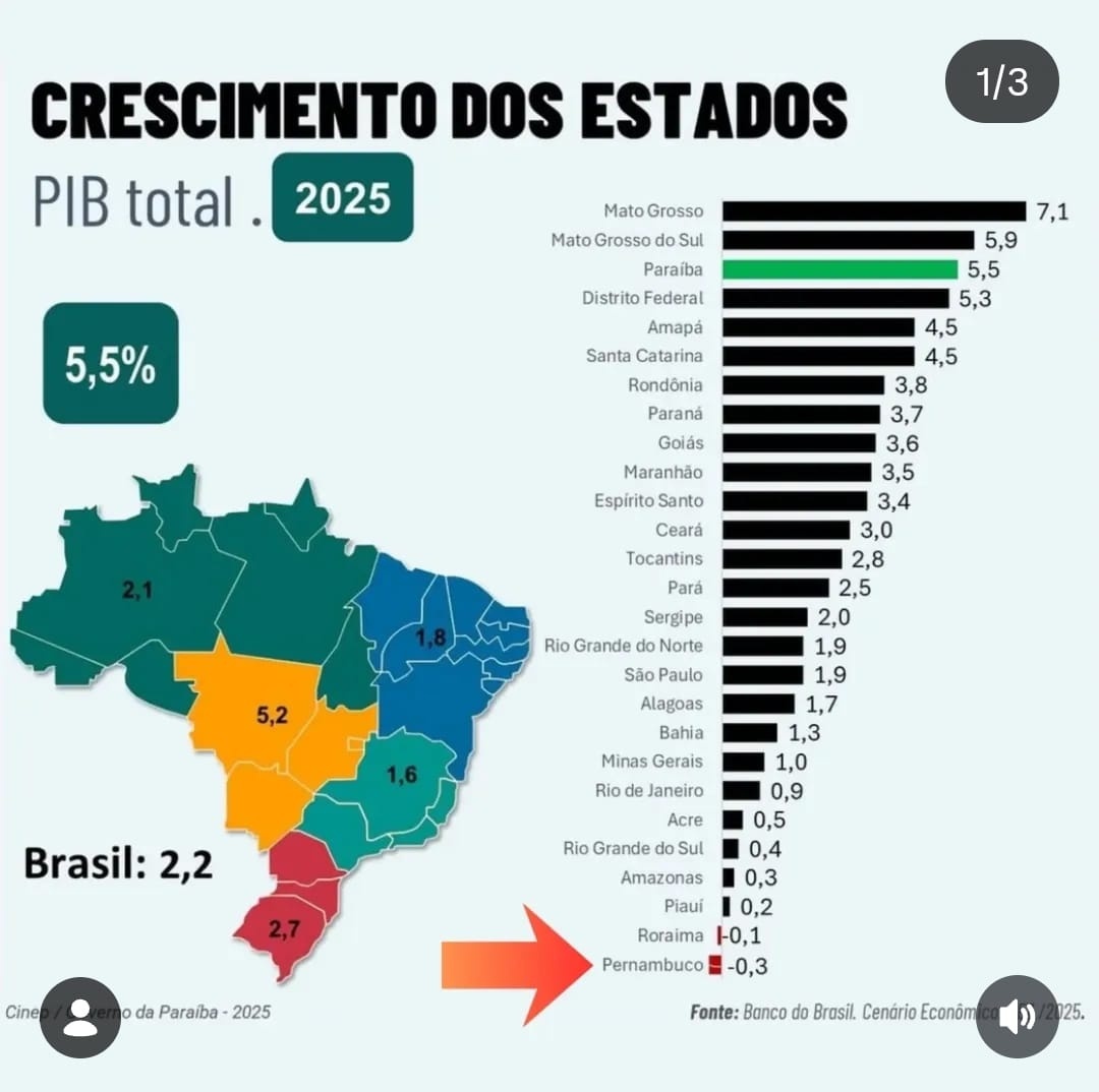 Outras regiões avançam em ritmo mais moderado. No Nordeste, a Paraíba se destaca com 5,5%, enquanto Maranhão e Ceará crescem abaixo da média nacional. No Sul, Santa Catarina registra 4,5%, mas o Rio Grande do Sul fica limitado a 0,4%, pressionado por fatores climáticos e fiscais.