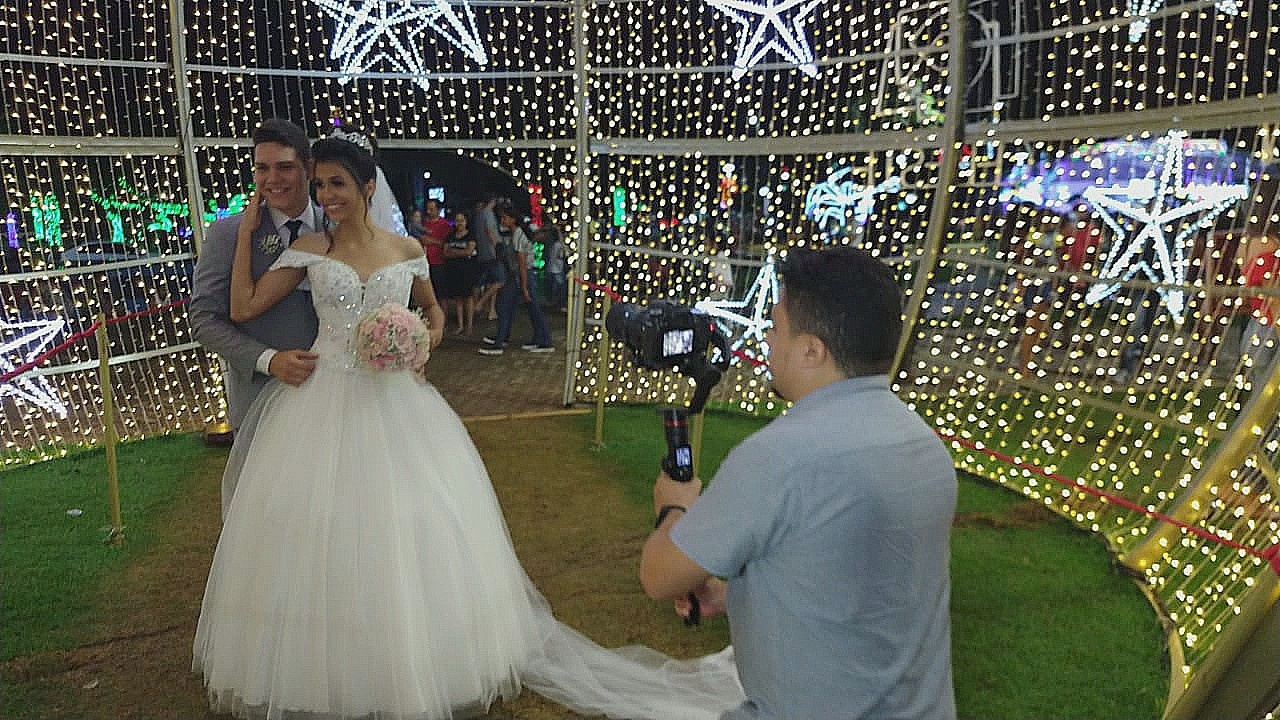 “É um ambiente diferente do convencional. O casal de noivos e a equipe de foto e vídeo decidiram, em conjunto, aproveitar as luzes de natal. A noiva no meio da decoração chamava a atenção das pessoas. Ficou um trabalho diferenciado, feito com a composição de imagens certas. Esse é meu segundo trabalho na Vila Natalina, o primeiro foi no ano passado”, relata.