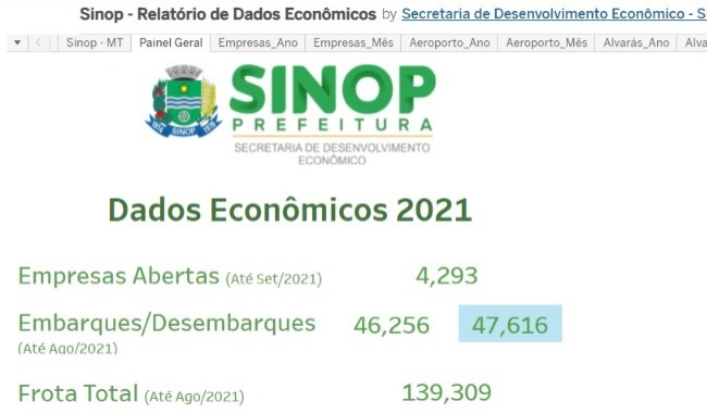 A secretaria realiza a consulta e compila os dados compreendendo as seguintes informações: novas empresas abertas (Fonte: Painel Mapa de Empresas – Governo Federal), movimentação do aeroporto (Agência Nacional de Aviação Civil - ANAC), frota (fonte: site Departamento Nacional de Trânsito – DENATRAN), números de Alvarás de Construção – PRODEURBS de Sinop e Balança Comercial.