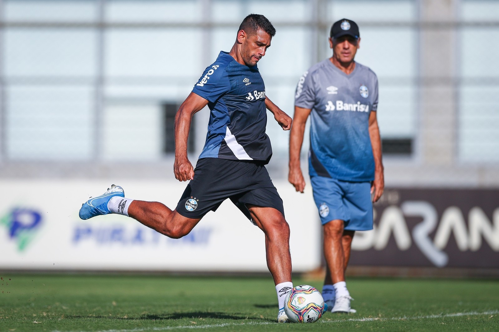 Diego Souza já se mostra solto no elenco gremista. No treino de quarta-feira, participou de uma atividade em campo reduzido com os titulares, enquanto os reservas realizaram um jogo-treino. Diego deu dois passes de categoria — e de centroavante — em tabelas curtas para gols de Everton.