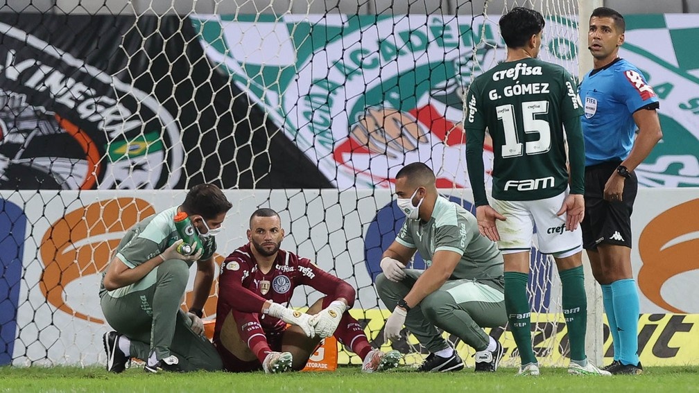 Weverton atendido por médicos em Atlético-MG x Palmeiras — Foto: César Greco