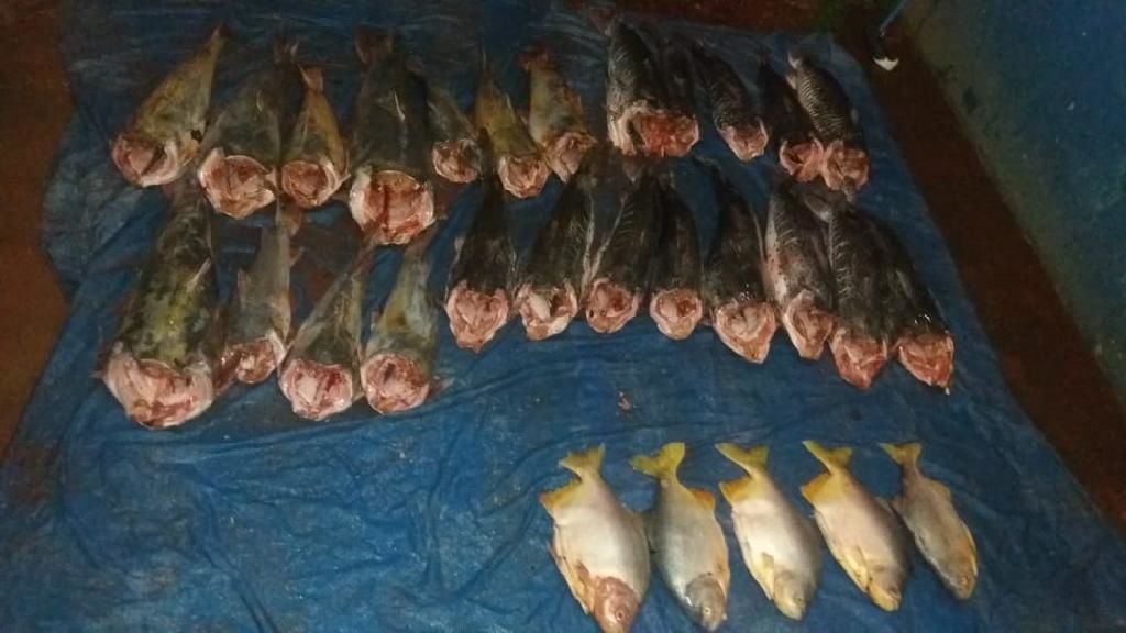 Dentro do carro os policiais encontraram 10 pintados, 11 jaús, três cacharas e cinco pacus, todos sem cabeça.