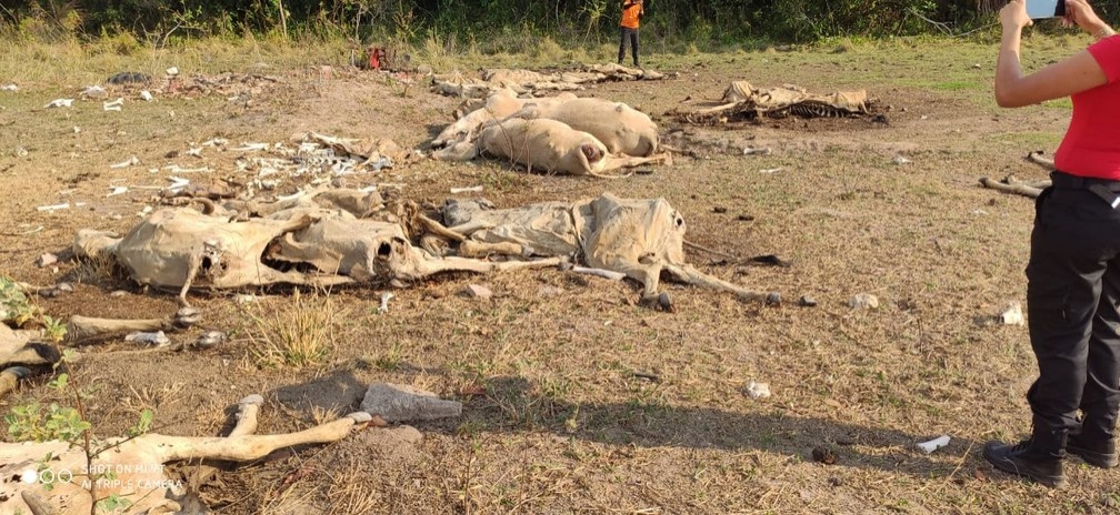 Uma denúncia levou policiais militares a encontrarem 40 bois mortos e outros desnutridos em uma propriedade rural em Araguaiana.