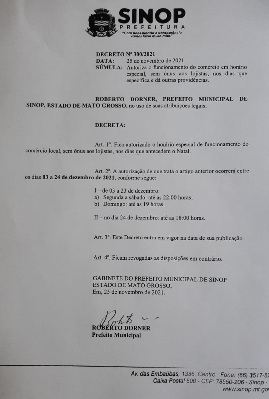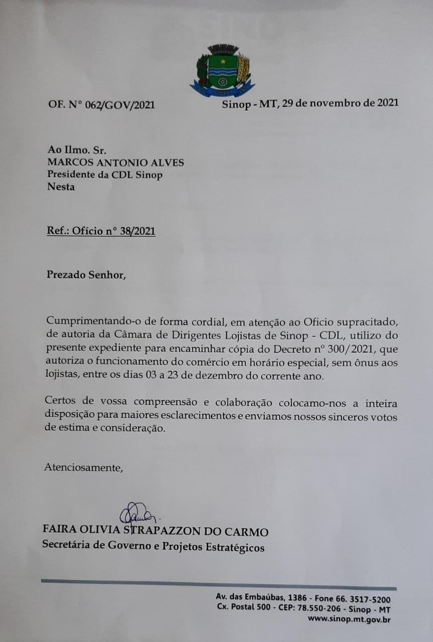 No ofício número 062/GOV/2021, consta a autorização do funcionamento do comércio em horário especial, sem ônus aos lojistas, entre os dias 3 e 23 de dezembro. Fica autorizado a abertura de segunda à sábado, até às 22h e aos domingo até às 19h. No dia 24 de dezembro, véspera de Natal, até as 18h.