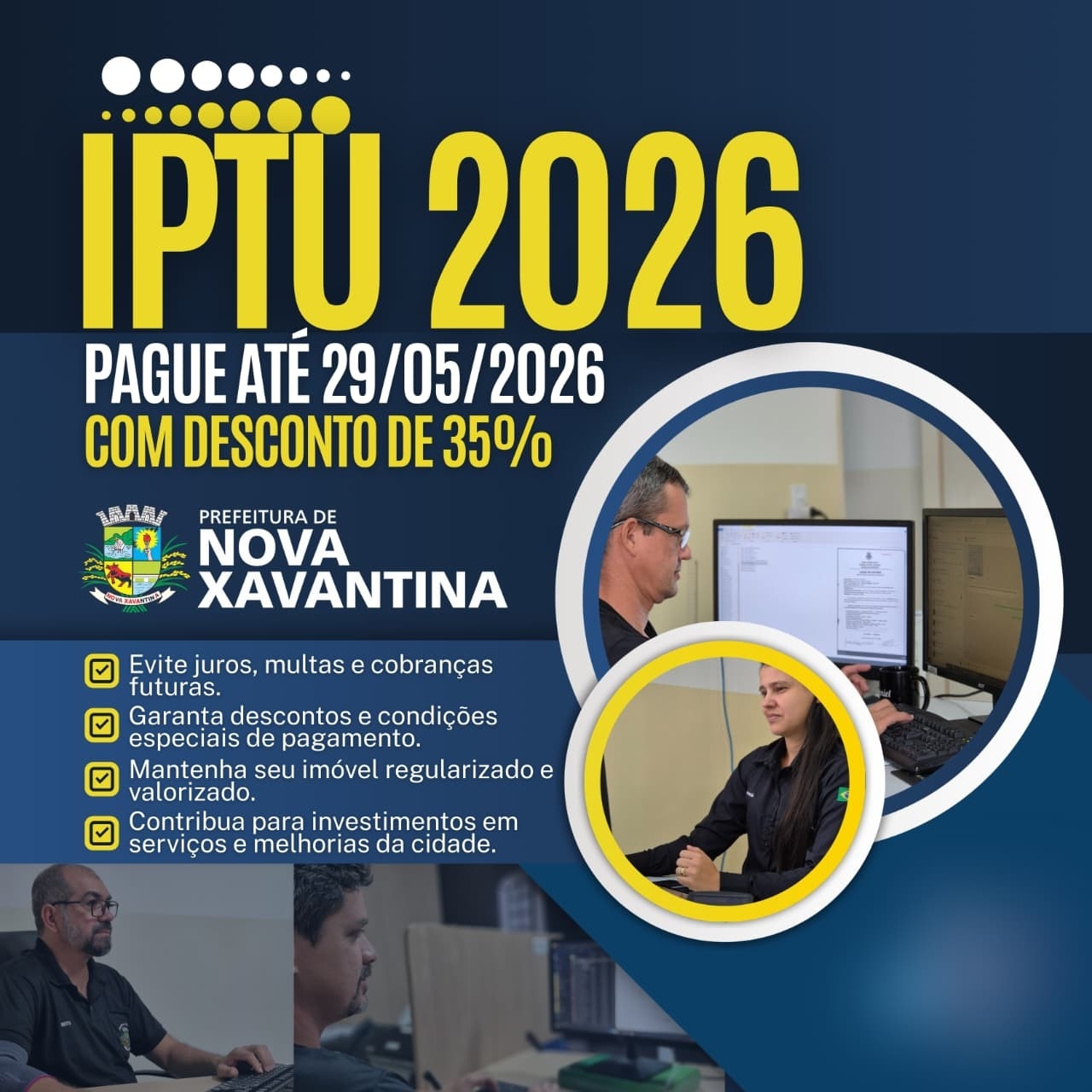 A Prefeitura de Nova Xavantina informa aos contribuintes que já está disponível a opção de pagamento do IPTU 2026 com desconto de 35%, válido para quem quitar o imposto até o dia 29 de maio de 2026.