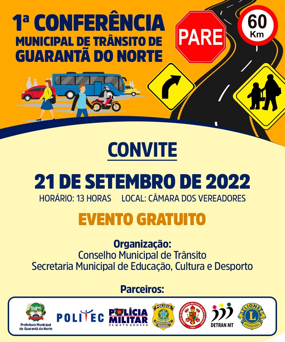 A Prefeitura de Guarantã do Norte promove no próximo dia 21 de setembro, a partir das 13h, a 1ª Conferência Municipal de Trânsito, no auditório da Câmara de Vereadores. O objetivo é iniciar o debate sobre a criação de um plano gerencial para melhorias do trânsito de município.