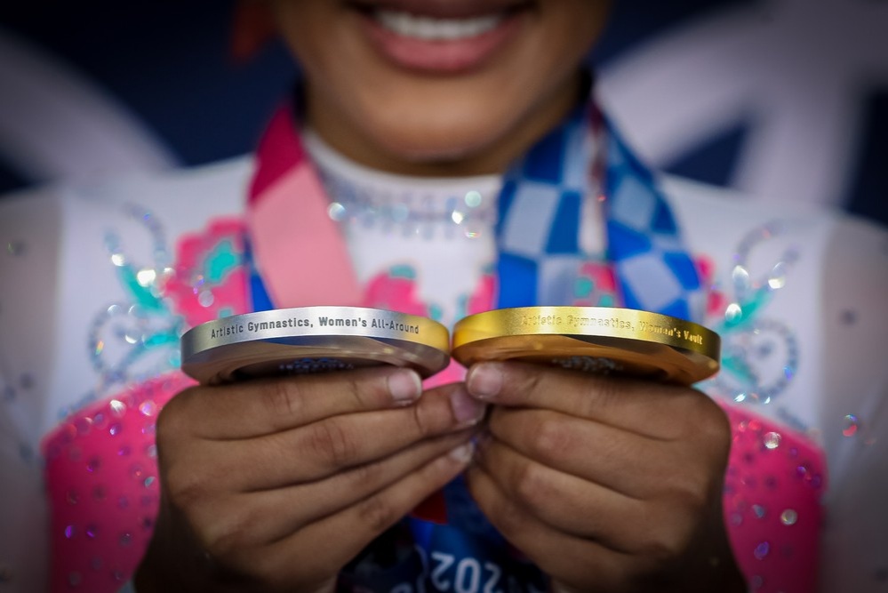 Rebeca Andrade com as medalhas de prata e ouro conquistadas nas Olimpíadas — Foto: Ricardo Bufolin
