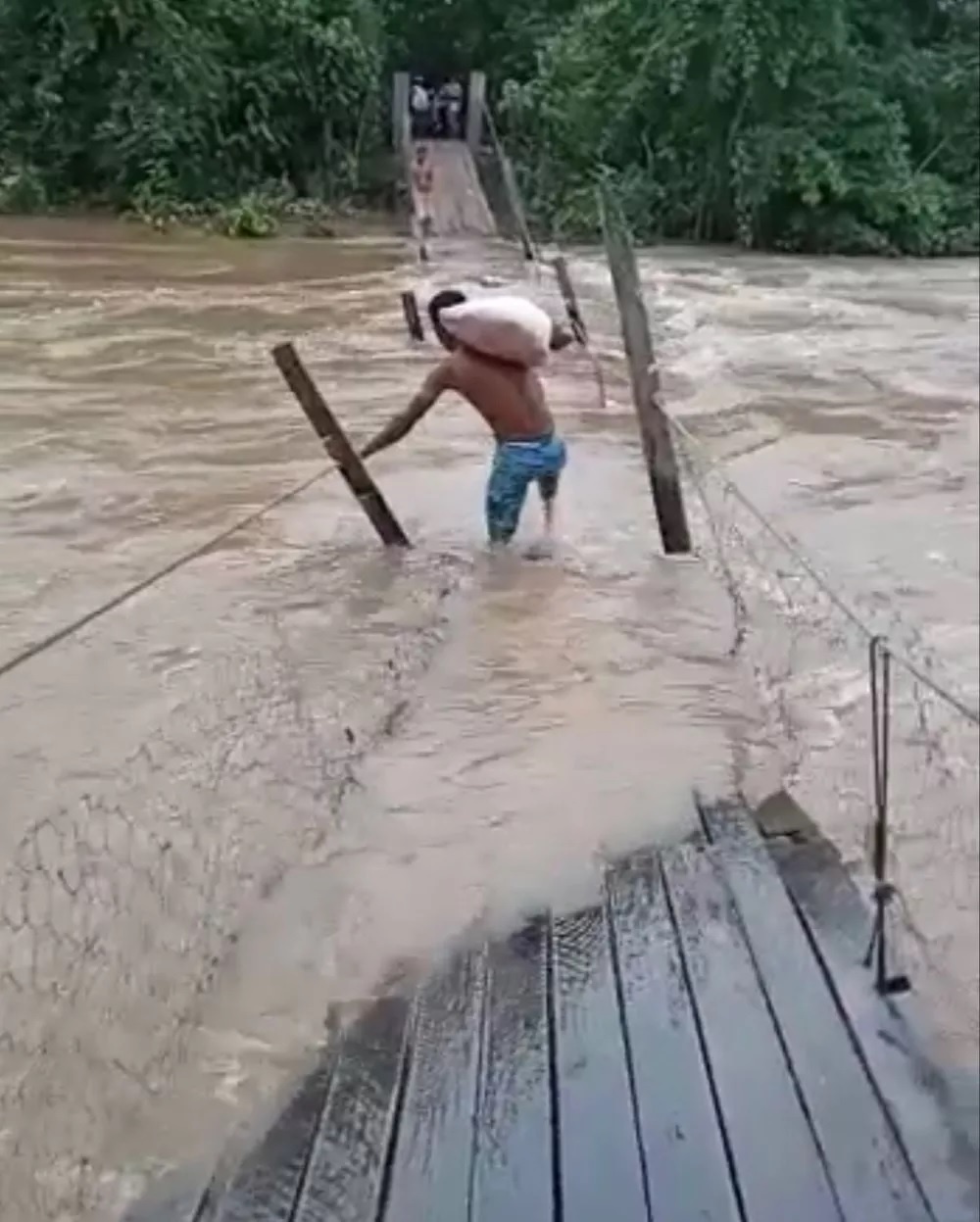 Moradores se arriscam em ponte quebrada para conseguir utensílios para a comunidade — Foto: Reprodução