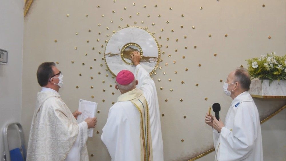 Na semana em que a Igreja recorda Santo Antônio, veio o pedido às pressas à artista plástica para fazer um relicário, projetado em formato circular, no mesmo mármore usado nos outros espaços idealizados por Mari Bueno no templo. No dia 13 de junho, então, em respeito às normas sanitárias por causa da pandemia, foi feita a deposição da massa óssea do padroeiro no relicário pelo bispo diocesano, Dom Canísio Klau.