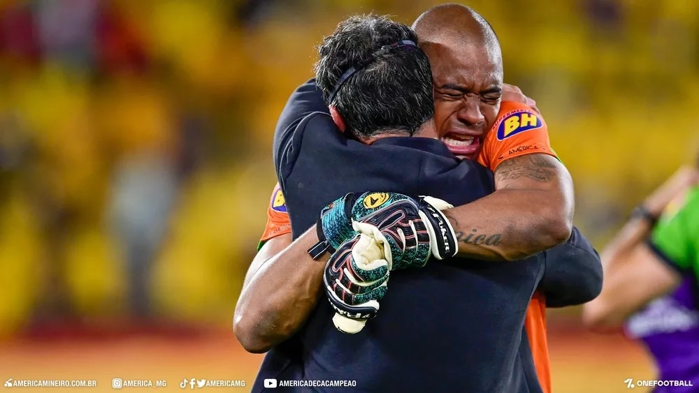 Jailson abraçado com Marquinhos Santos após classificação do América-MG — Foto: Mourão Panda/AFC