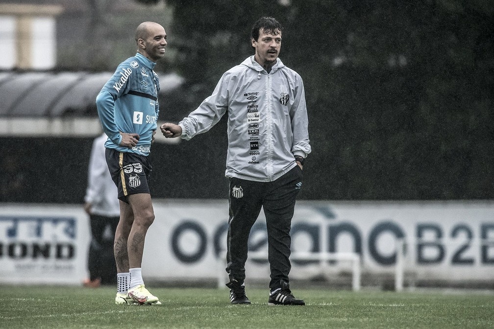 Diego Tardelli e Fernando Diniz durante treino no CT Rei Pelé — Foto: Ivan Storti