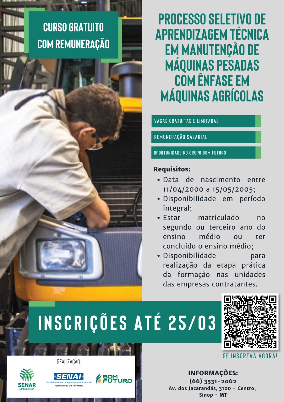 O Serviço Nacional de Aprendizagem Industrial (Senai) de Sinop, em parceria com o Serviço Nacional de Aprendizagem Rural (Senar-MT) e a Bom Futuro, estão com inscrições abertas para o processo seletivo do curso de Aprendizagem Técnica em Manutenção de Máquinas Pesadas, com ênfase em máquinas agrícolas.