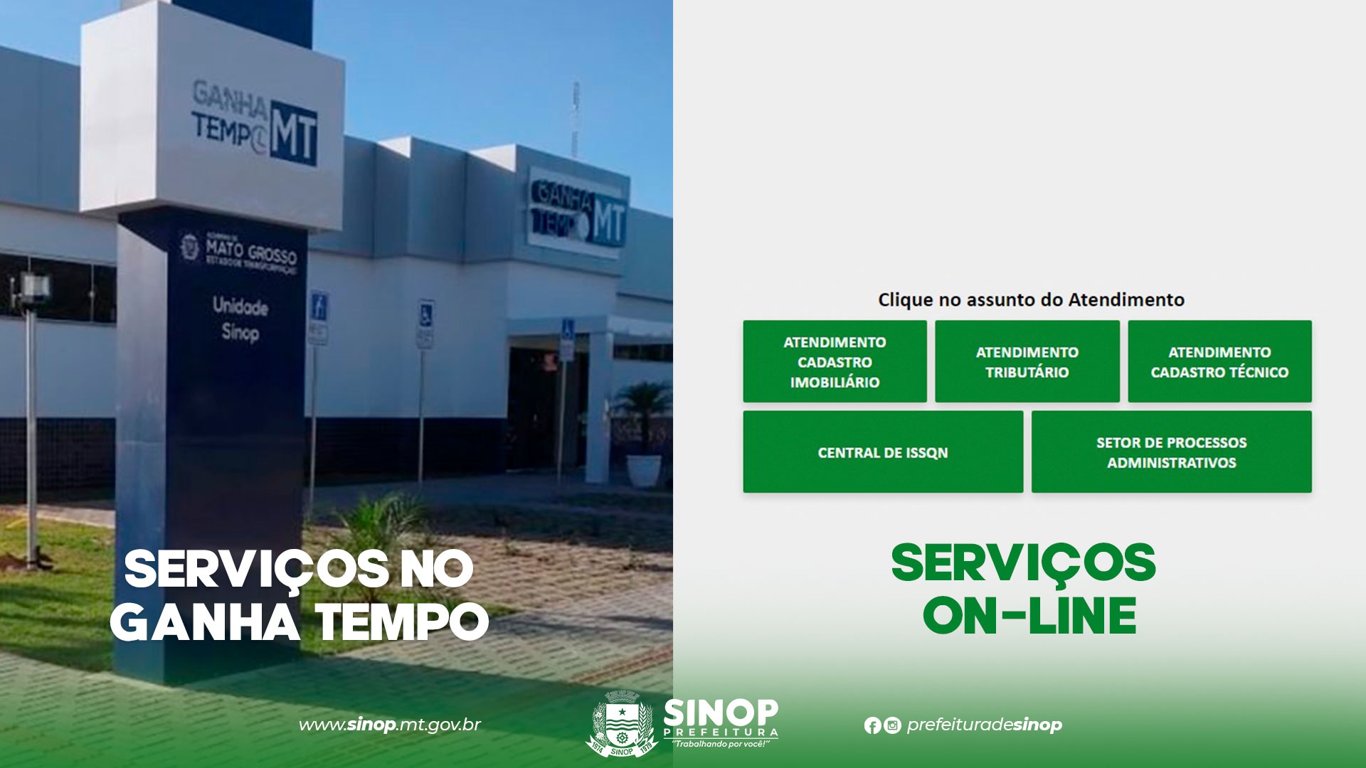 Outra opção para o contribuinte é o atendimento on-line ofertado através do site da Prefeitura (https://www.gp.srv.br/atendimento_sinop/servlet/mselecionar_assunto_online_html?13,,1,0 ) no atendimento do cadastro imobiliário, como emissão de guias, atualizações, IPTU e taxa de lixo; vistoria para lançamento de área construída – alterações das características; atualização cadastral para pessoa física / proprietário, inclusão de numeração no imóvel, transferências de imóveis, unificação e desmembramento; isenção de IPTU de associações, autarquias, igrejas, templos de qualquer culto, imóveis locados para o município, entre outros.