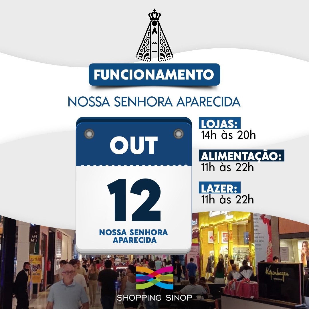O Shopping Sinop terá horário especial de atendimento durante o feriado do dia 12 de Outubro, no qual celebra-se o Dia de Nossa Senhora Aparecida e o Dia das Crianças.