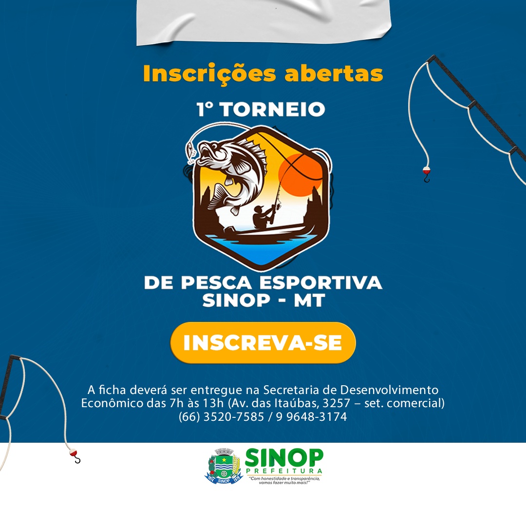 As inscrições para o 1° Torneio de Pesca Esportiva com Iscas Artificiais, em Sinop, foram prorrogadas e seguem até sexta (27). A inscrição pode ser feita na Secretária de Desenvolvimento Econômico (Sedec), que fica na Avenida das Itaubás, 3257, setor comercial, ou pelos telefones 3520-7585 ou 99648-3174.