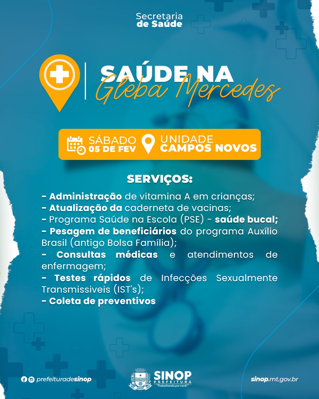 A Secretaria de Saúde de Sinop realiza neste sábado (5) uma ação especial de atendimentos aos moradores da região da Gleba Mercedes.