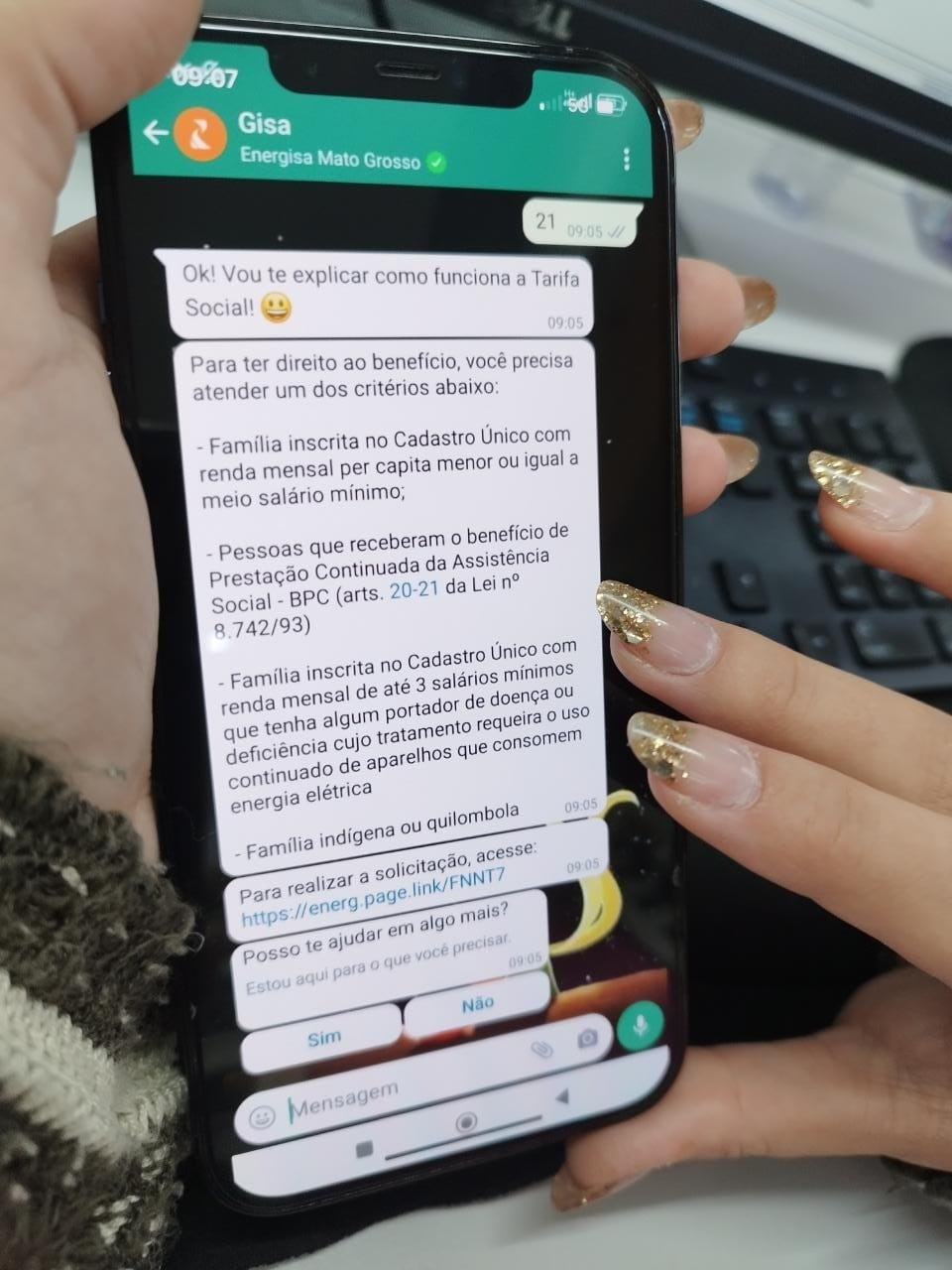 Os beneficiários precisam atender alguns critérios definidos pelo governo, são eles: famílias indígenas ou quilombolas; inscritos no Cadastro Único (cadÚnico) para programas sociais do governo federal com renda mensal menor ou igual a meio salário-mínimo por pessoa; inscritos no cadÚnico com renda de até três salários-mínimos e que sejam portadores de doenças ou deficiência que necessite de tratamento continuado usando aparelhos que demandem do uso de energia elétrica; famílias inscritas no Benefício de Prestação Continuada da Assistência Social (BPC), ou seja, idosos com idade de 65 anos ou mais e deficientes, cuja renda mensal familiar per capita seja inferior a um quarto do salário-mínimo. O benefício é progressivo, ou seja, depende do consumo de cada cliente. Canais oficiais: Call Center 0800 646 4196; Site: www.energisa.com.br; WhatsApp (Gisa) 65 99999-7974.