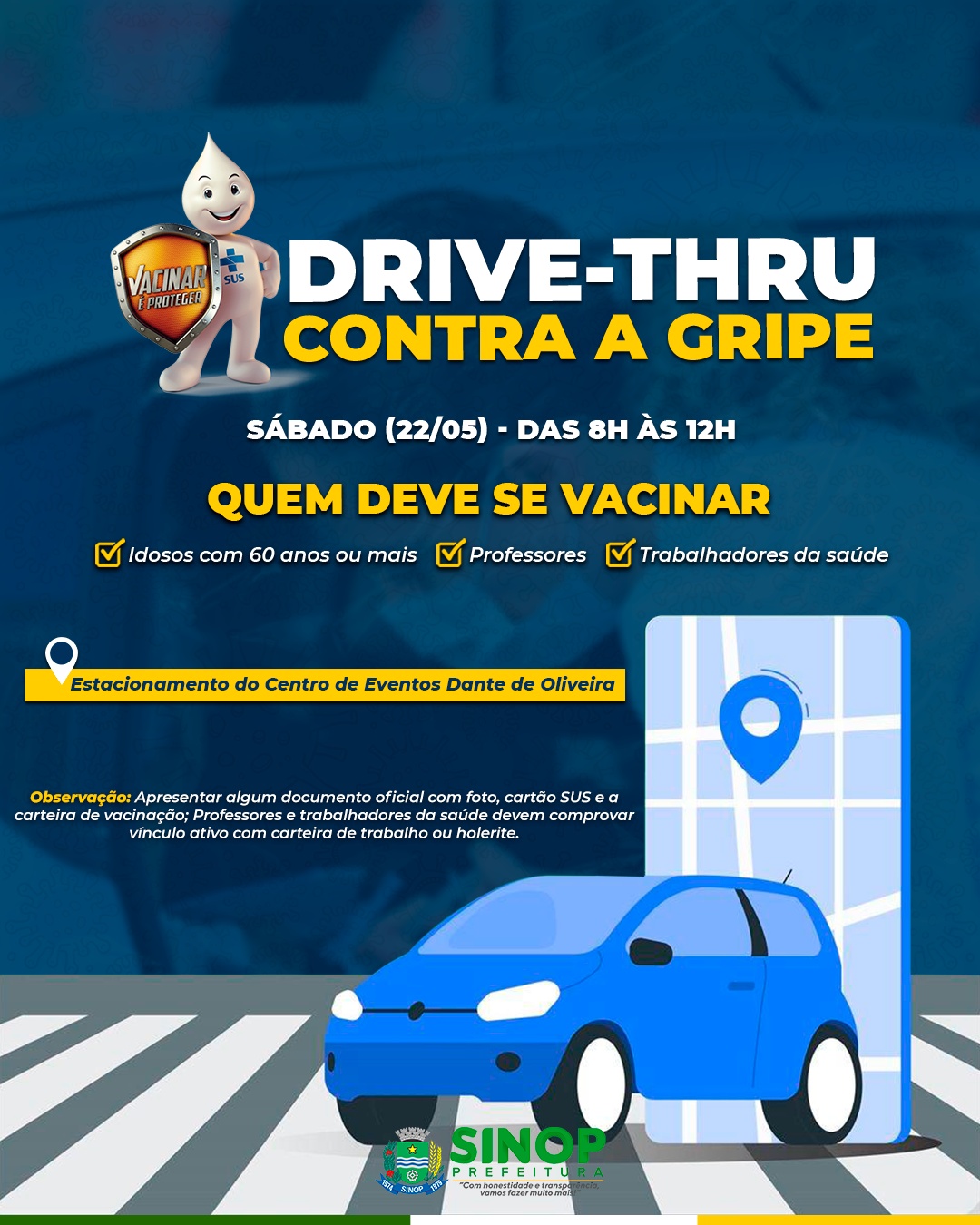 A Secretaria de Saúde de Sinop realizará, sábado (22), um novo drive-thru de vacinação. Desta vez, voltado especificamente para a campanha nacional de vacinação contra gripe. A ação, que será realizada das 8h às 12h no estacionamento do Centro de Eventos Dante de Oliveira, tem como objetivo atender os trabalhadores da área da saúde, professores e idosos com 60 anos ou mais.
