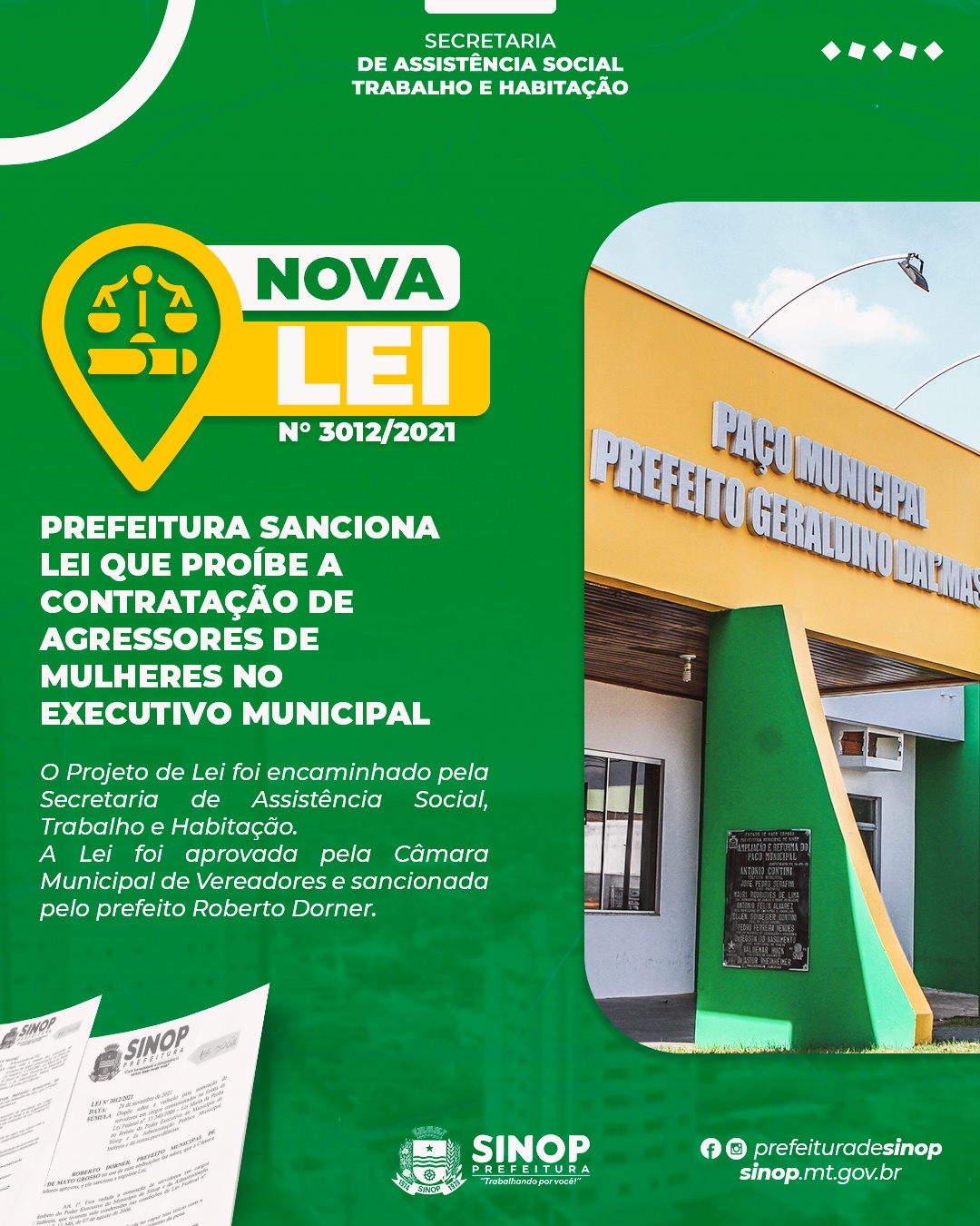 O prefeito Roberto Dorner sancionou a Lei n° 3012/2021 que veda a nomeação de servidores em cargos comissionados no âmbito do Poder Executivo Municipal de Sinop e da Administração Pública Indireta, que tiverem sido condenados em decisão transitada em julgado, ou seja, quando não cabe mais recursos, na Lei Federal Maria da Penha. A proposta, de autoria da primeira-dama e secretária de Assistência Social, Trabalho e Habitação, Scheila Pedroso, foi aprovada por unanimidade na Câmara Municipal de Vereadores.